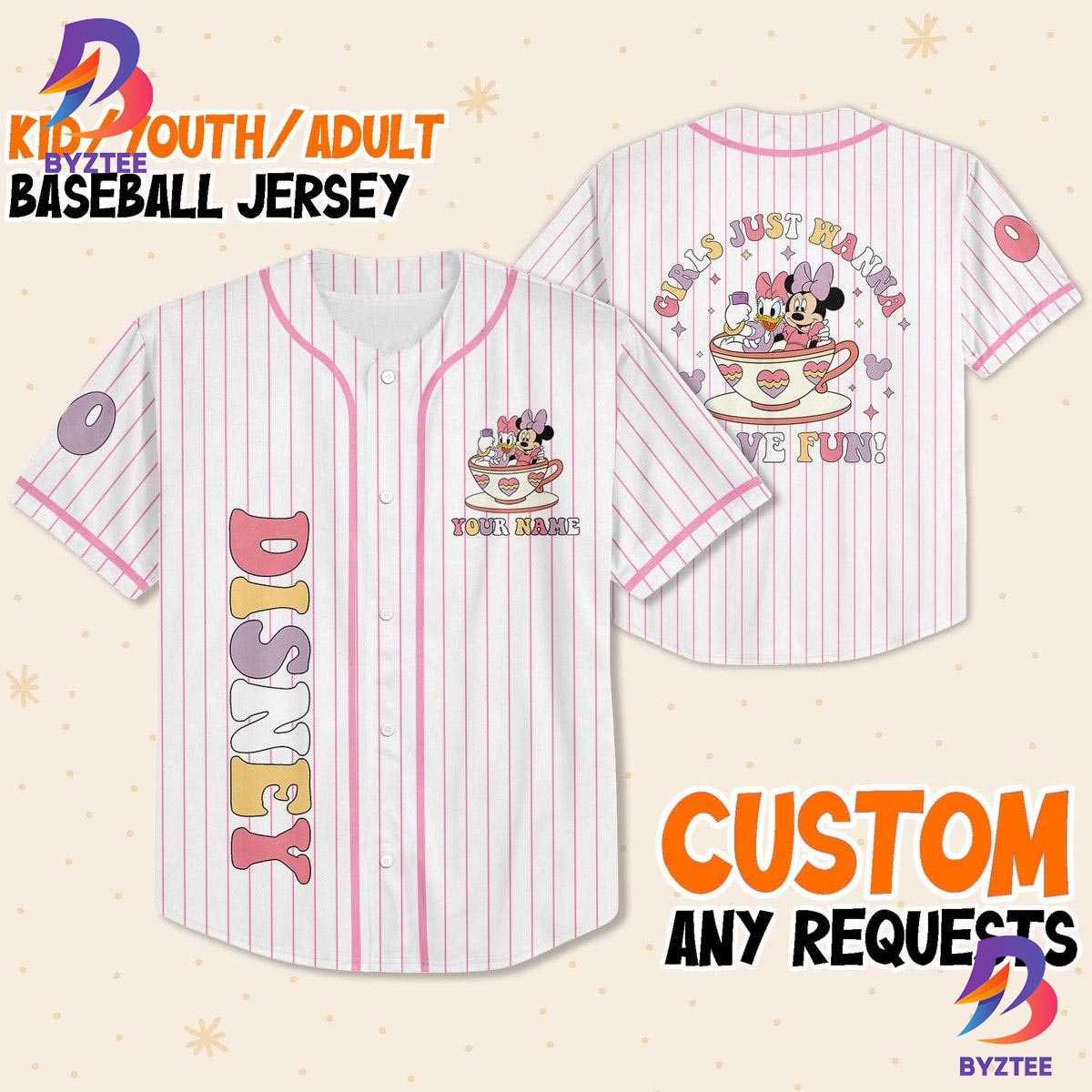 Personalize Disney Daisy And Minnie Girls Just Wanna Have Fun Baseball Jersey